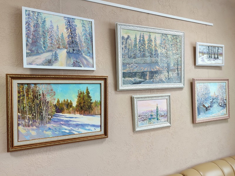 Выставка картин художницы Наталии Рудый была оформлена в красивых багетах в фойе здания администрации города Нижний Тагил. В основном это пейзажи с видами уральской природы и города Нижний Тагил.