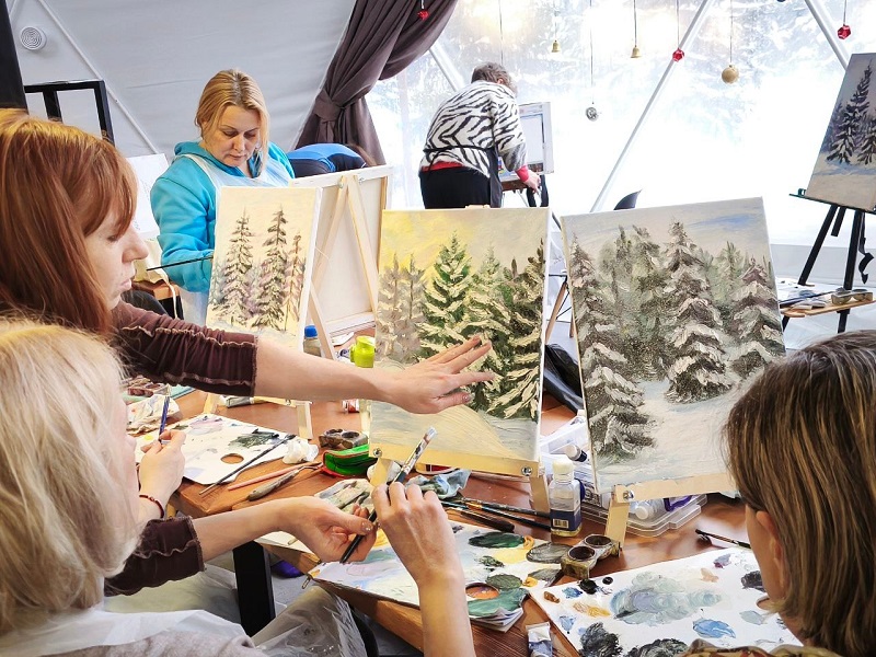 Наталия учит начинающих художников обрабатывать холст, смешивать краски, делать фон картины и набросок, как нанести блики масляными красками. Сюжеты картин Наталия предлагает сама, в основном это природные пейзажи. Участники мастерской на занятии рисуют одну и ту же картину, и результат радует всех.