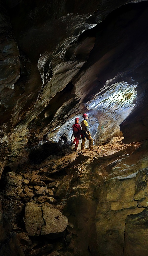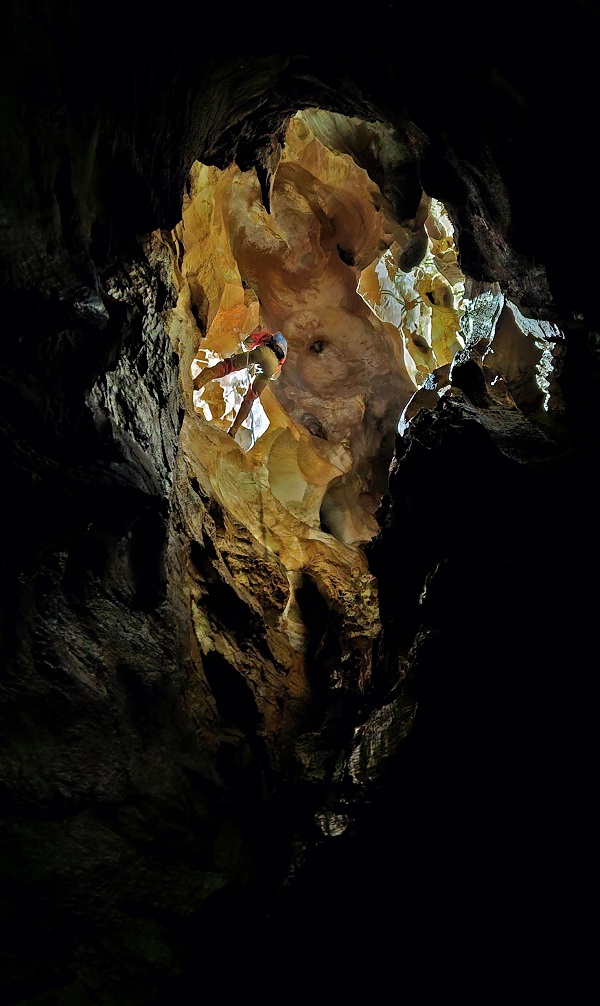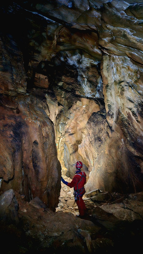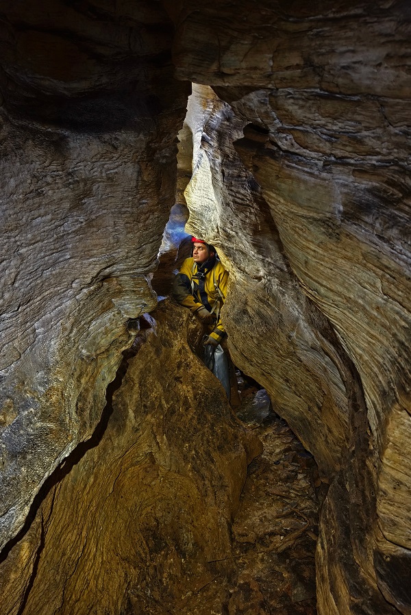 В этой пещере придётся много ползти и карабкаться, протискиваясь сквозь узкие щели. «Неприятности» добавляет высокая влажность и обильная глина.