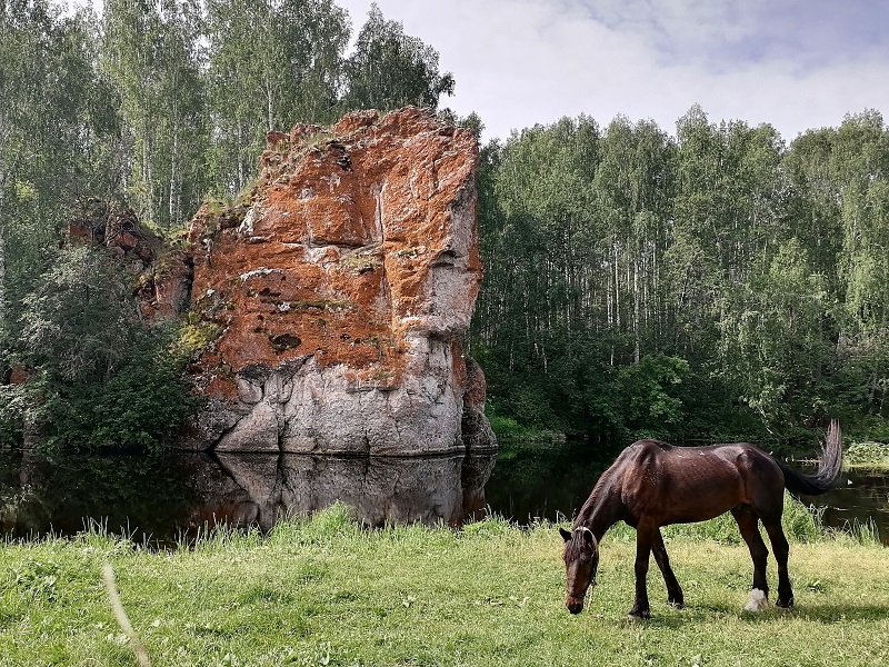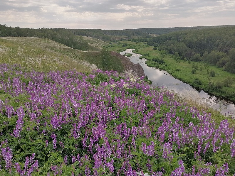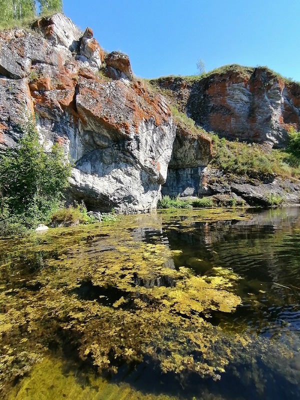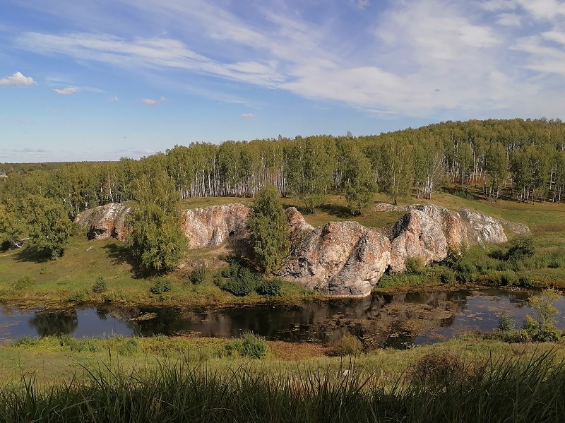 А «невидимкой» я назвала эту реку потому, что ее чудеса скрыты от глаз и даже, можно сказать замаскированы приятным, но вполне рядовым ландшафтом окружения: зарастающие поля, березовые рощи, сосновые леса, раскинувшиеся на вполне ровном рельефе, окружают вас, если вы поедете по автодороге, которая идет параллельно реке, и вы даже не догадаетесь, — если не знали этого заранее,- что, если выйти из машины и пройти не более километра в сторону реки, – вам откроется внезапная и яркая красота природы, заключенная в глубоких распадках, нависших над водой высоких скалах, и прочих интересных природных объектах.
