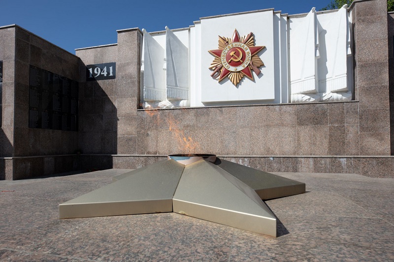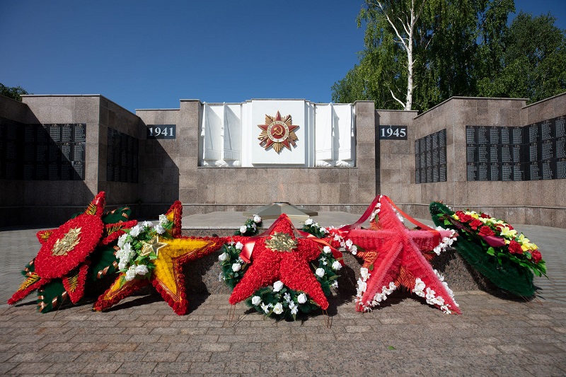 На гранитных плитах мемориала высечены фамилии сотен земляков, участвовавших в Великой Отечественной войне, а с краю гранитных стен можно увидеть барельефы — единственные элементы первоначального монумента, стоявшего на этом месте до реставрации 2019 года.