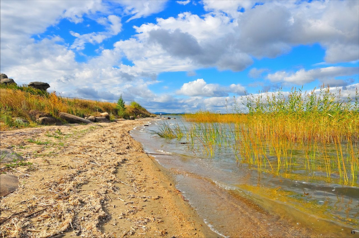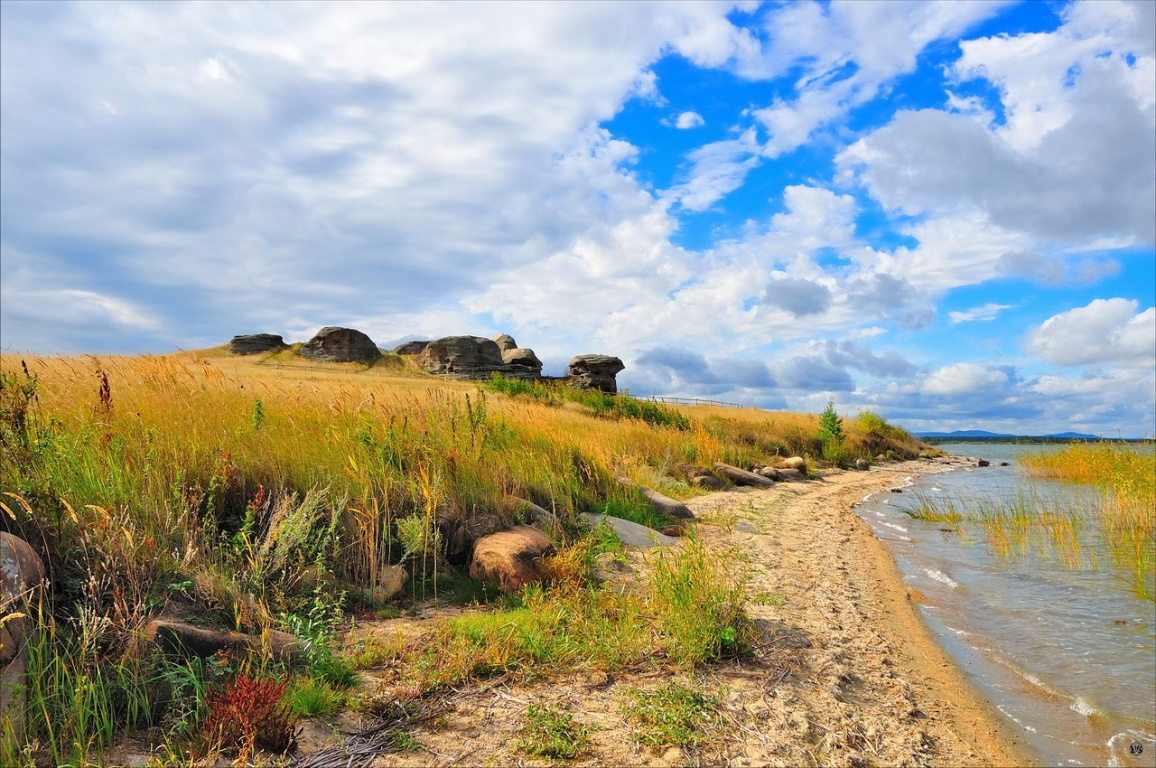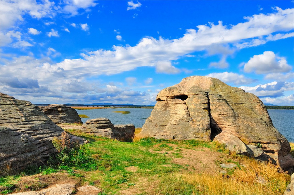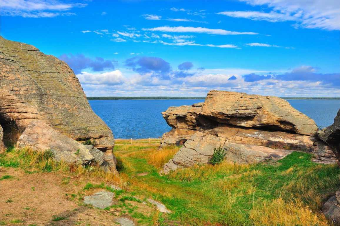 В двух местах (на юго-восточном и западном берегах) имеются гранитные скалы – Каменные палатки. Их называют Бей-таш и Кинель-таш. Это главная достопримечательность этих мест.