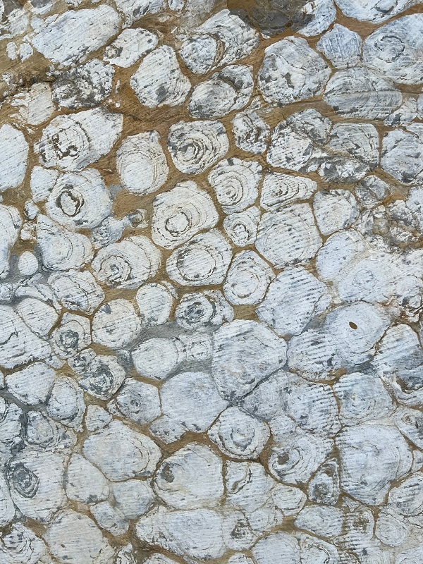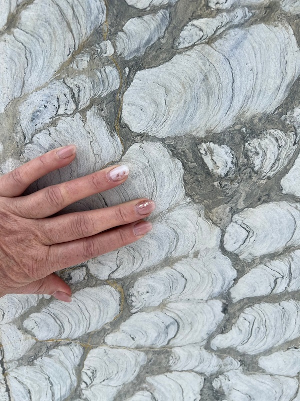Строматолиты — отложения древнего моря, древнейшие следы жизни, продукты жизнедеятельности цианобактерий (царство Cyanobionta) — первых фотосинтезирующих организмов на Земле. На их срезе можно увидеть волнистый или струйчатый рисунок.