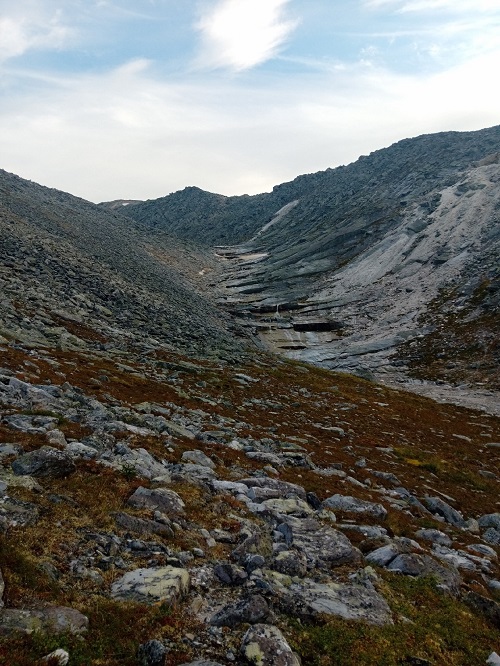 Бодрым шагом поднялись по снежнику и свернули влево на мелкий курум. Седловина, действительно, порадовала пологим и несложным подъемом и на хребет забежали быстро и без проблем. А вот спуск в долину оказался проблемным. Единственный, более менее реальный спуск в долину выглядел, как узкий и крутой уступ с поворотом, покрытый мелкой сыпухой. А справа и слева от него обрывы.