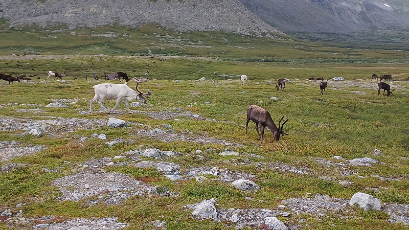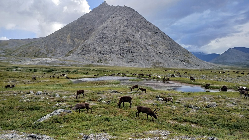Сверху увидели маленькие черные точки — причина женских истерик и слез умиления — стада северных оленей. Много. К счастью, они нас не дождались и ушли в сторону от тропы, но запах свой оставили…