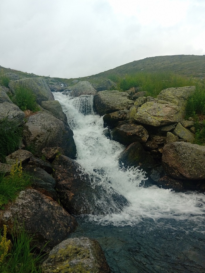 Вниз идти приятно и легко, тропа широкая, удобная, погода прекрасная. Не совсем. Погода солнечная, но затягивало с соседних долин забрасывало дождем из плотных облаков. Пока везло. Уперлись в брод. Воды по колено и она просто ледяная.