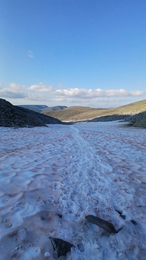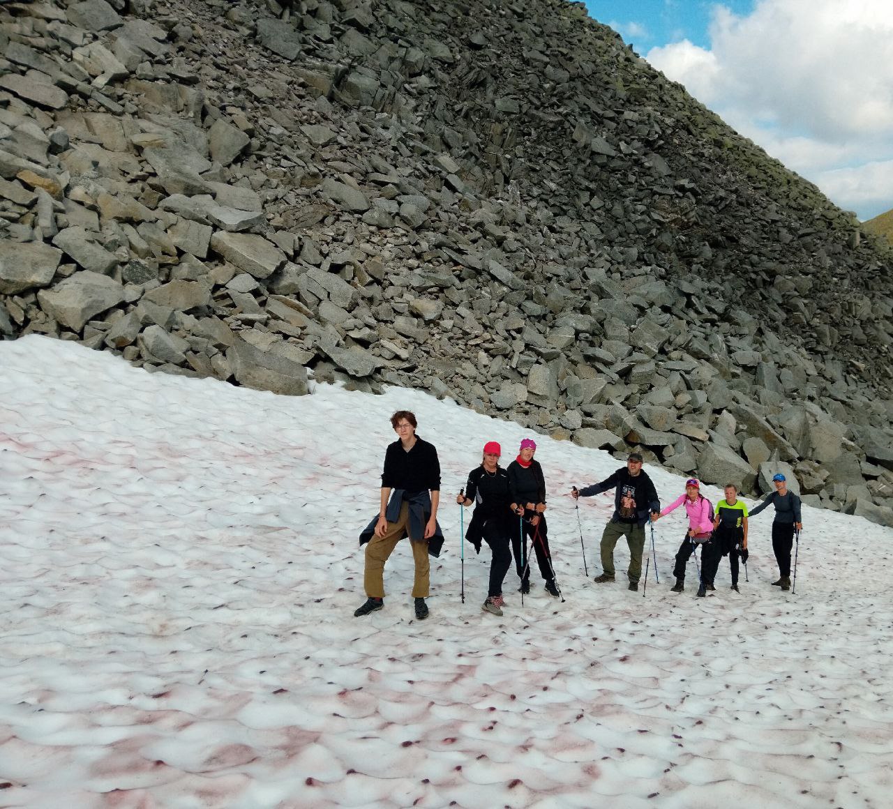Обратно пришлось ускориться и срезать путь через ущелье с ручьем Каменистым. Было весело (как минимум, не скучно), но все справились, а заодно потренировались в ходьбе по куруму. А снежники вблизи оказались розоватыми от водорослей. Поиграли в снежки и бодро спустились на базу. Душ и кровати с постельным бельем не отпустили в палатки. Завтра выходим на маршрут.