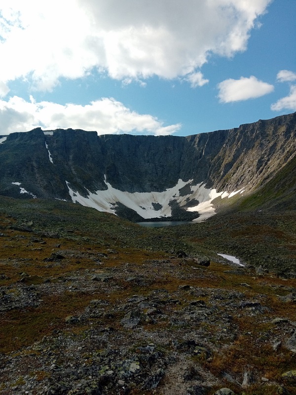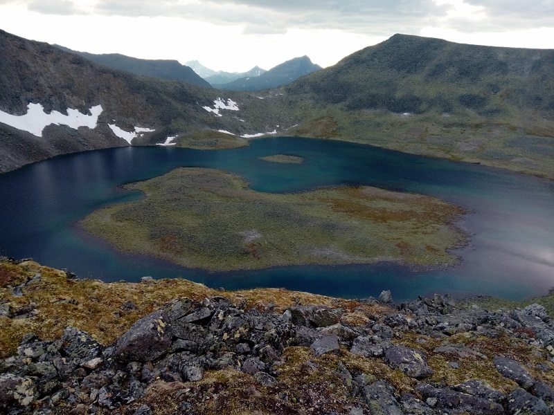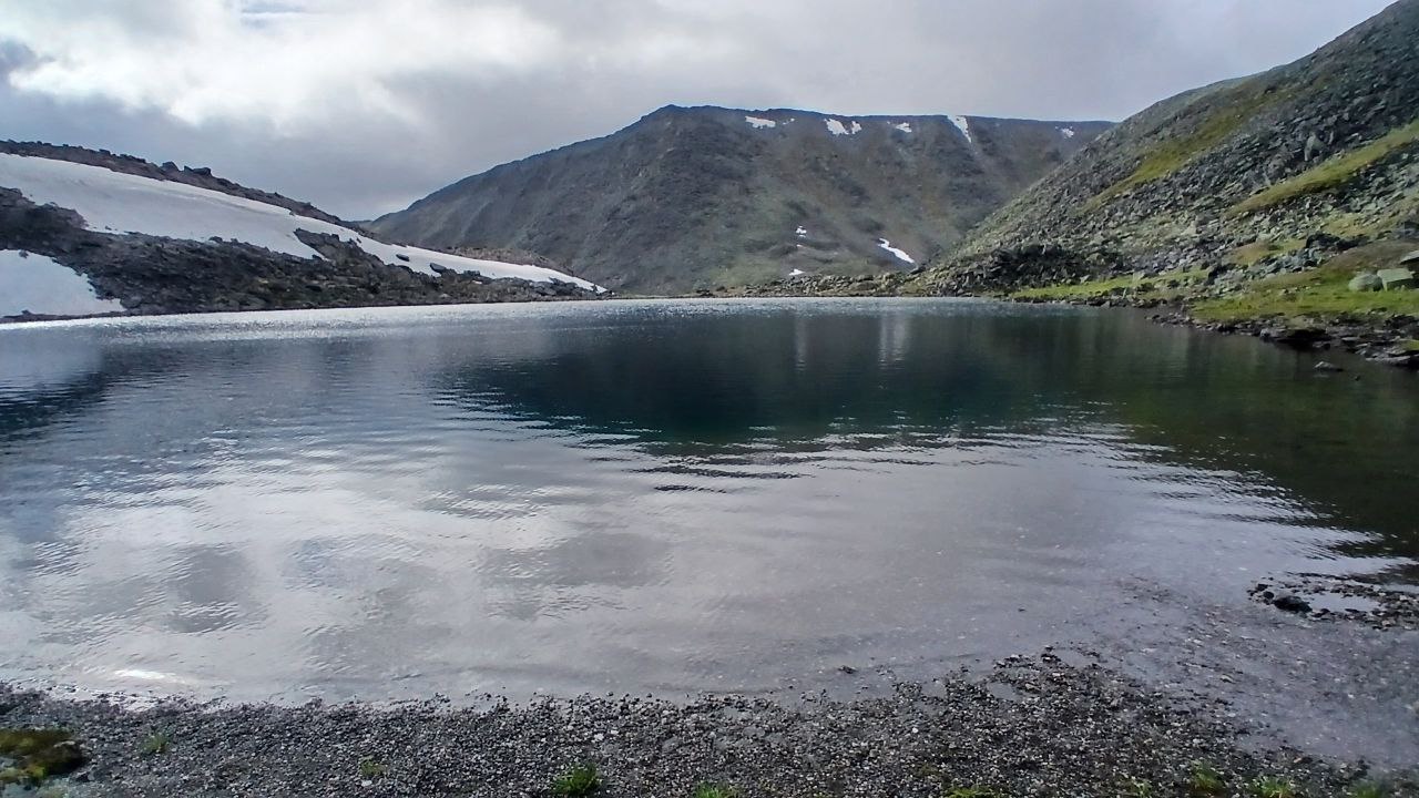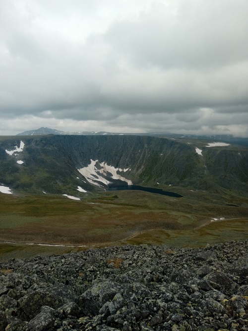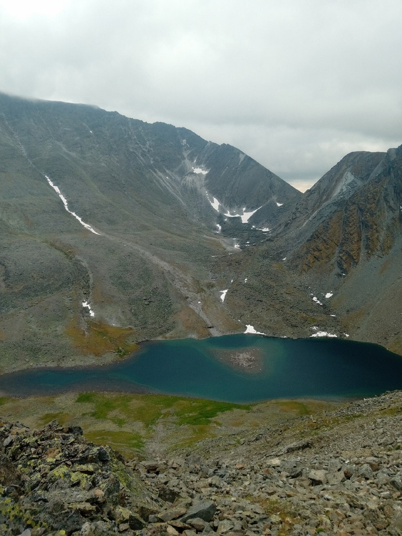 Долина закончилась и начался крутой затяжной подъем. Который уперся в курум. Крупный, с диван размером, он хаотично валялся длинными осыпями и уступами, заставляя петлять и тщательно выбирать место для ноги. Видно было свежие обвалы, еще не заросшие лишайником, частенько огромные каменные глыбы неприятно шатались под ногами… И все время круто вверх. С рюкзаками это, прям, испытание. Под конец бесконечного подъема Никита начал челночить, ибо сил хватило не всем… Но мы дошли. На последнем перед перевалом Зиг Заг, уступе нам открылось круглое озеро с черным песком и черной бездной почти сразу от берега. С погодой везло, так что пообедали под приятным солнышком на берегу вулканического озера, любуясь на горы и снежники.