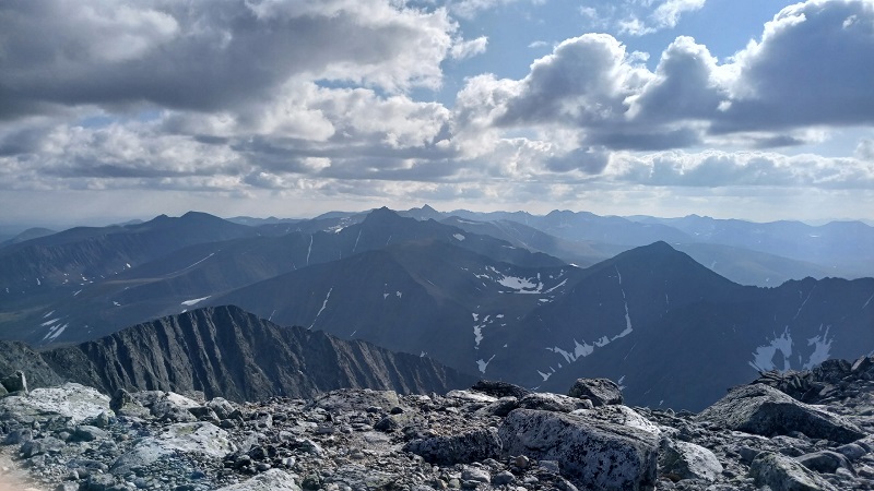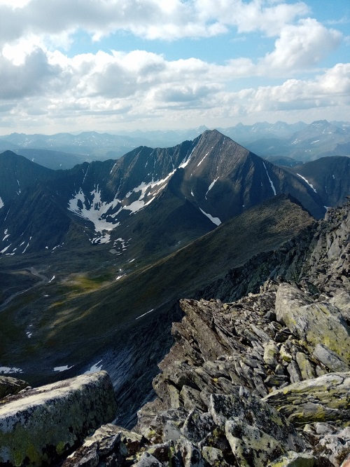 Так или иначе, но вышли на штурм, вклинившись в цепочку коммерции. В лощине лежит снег, сверху жарит солнце — интересное ощущение. Чуть выше пошла сыпуха и курум. И виды, от которых захватывает дух. С погодой повезло и восхождение прошло под знаком фотографий, видосов и привалов.