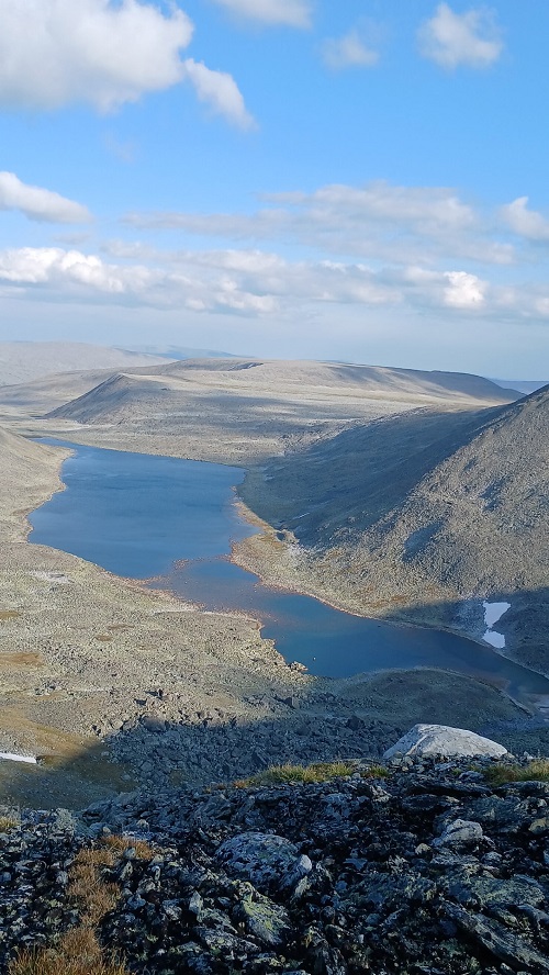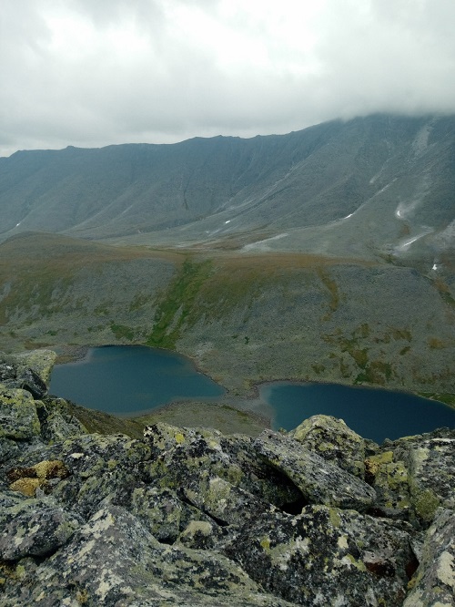 В качестве компенсации, решили подняться на безымянную вершину 1345 м. (зря шли, что ли?!) Ну, и осмотреться, конечно. Отсюда отлично видна долина реки Балбан Ю, откуда мы пришли, озеро Бублик с лагерем, озеро Тейс и озеро Восьмерка.