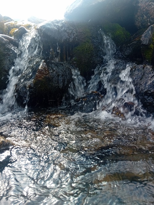 Спуск в долину широкими уступами с крутыми склонами и каждый следующий уступ, по чуть-чуть, открывает вид на долину и реку Манарага где-то далеко внизу. И, да, это снова было старое жерло вулкана с отвесными скалами с одной стороны и застывшими волнами с другой. По ним мы, собственно, и спускались. У горного ручья обновили воду — холодненькая…