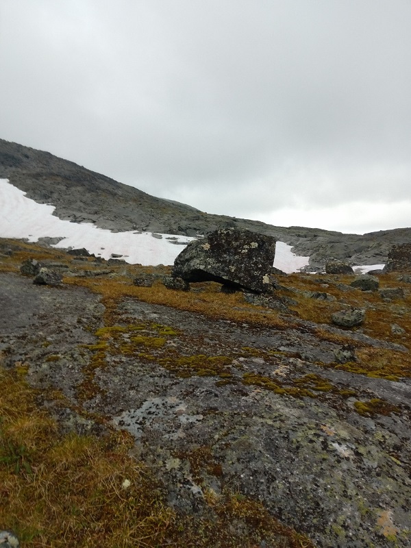 Взобрались легко и снова оказались в другом мире. Узкая долина с низкими облаками, стелющимися прямо по снежникам и камням внизу. Солнце пропало сразу же, как будто его не пустили сюда. А в долине лежат длинные глыбы, похожие на вросших в мох спящих каменных великанов. Пока шли не покидало стойкое ощущение таинственности этого места.