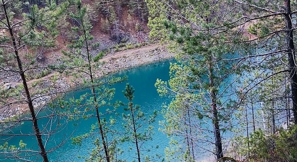 Со временем выработки месторождений затопило и они превратились в живописное озеро. Вода в карьере лазурного цвета, так как тут преобладают известняковые породы.