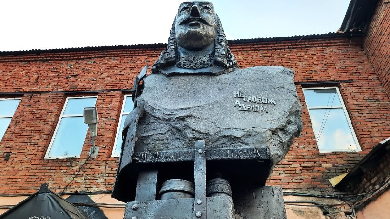 Автор создал памятник-бюст Акинфию Демидову из листовых титановых и нержавеющих сплавов, сваркой и клепкой.