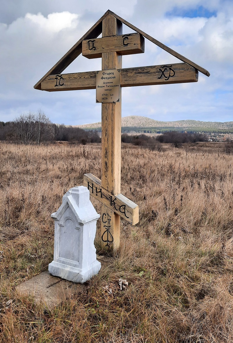 В прошлом году мы посетили это священное место, где похоронен старец Феодосий около реки Тагил в Верхнем Тагиле. На кресте прикреплена табличка «Старец Феодосий. Духовник Верхне-Тагильского завода 1750 – 1823». Под крестом установлен небольшой мраморный памятник.