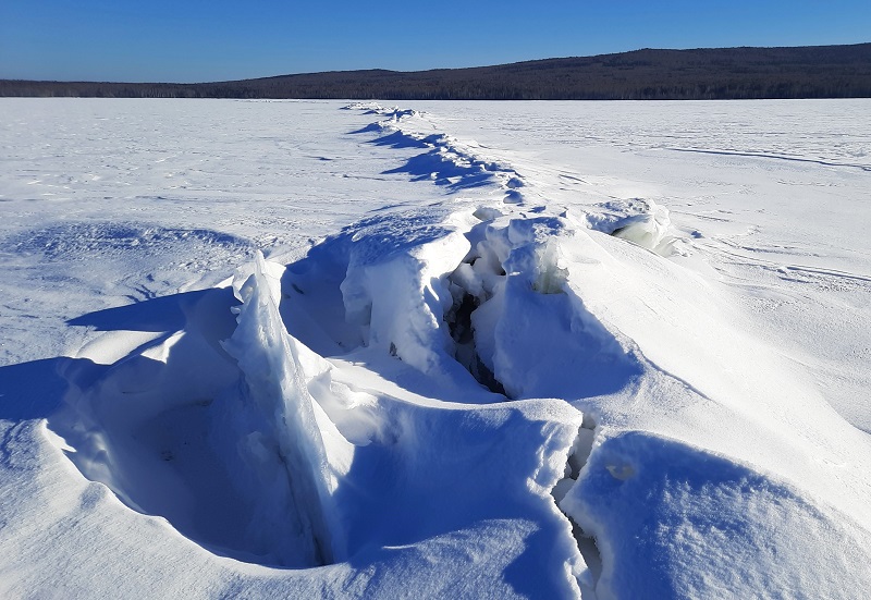 Трещина через весь пруд образуется в процессе сдавливания льда на пруду. Толщина льда достигает около одного метра.