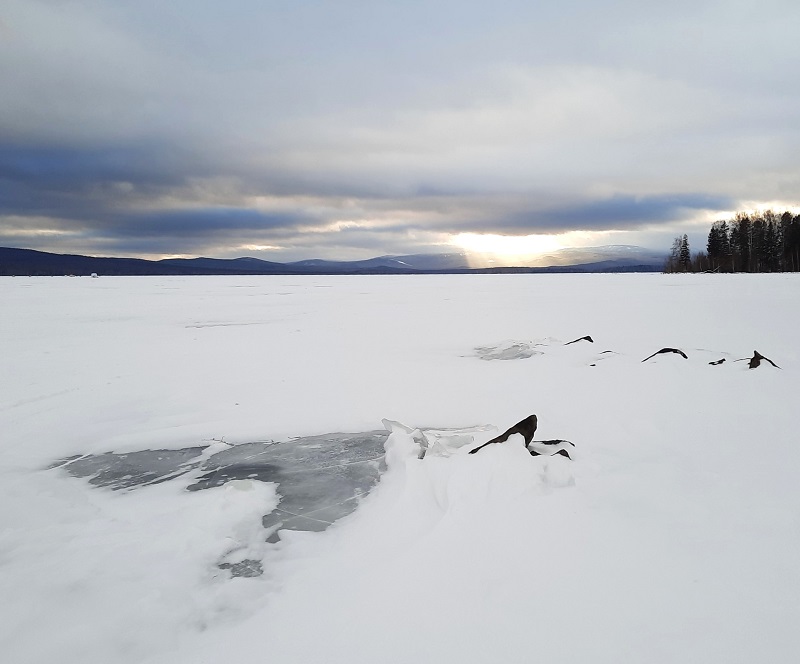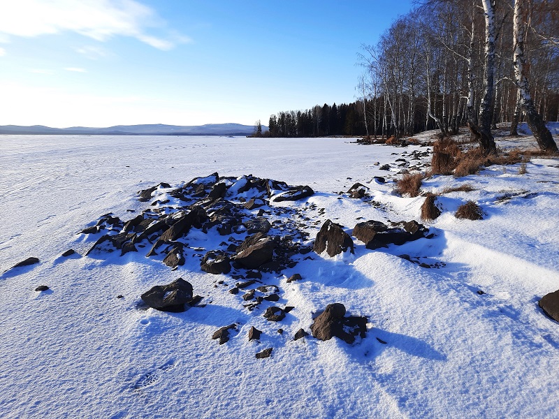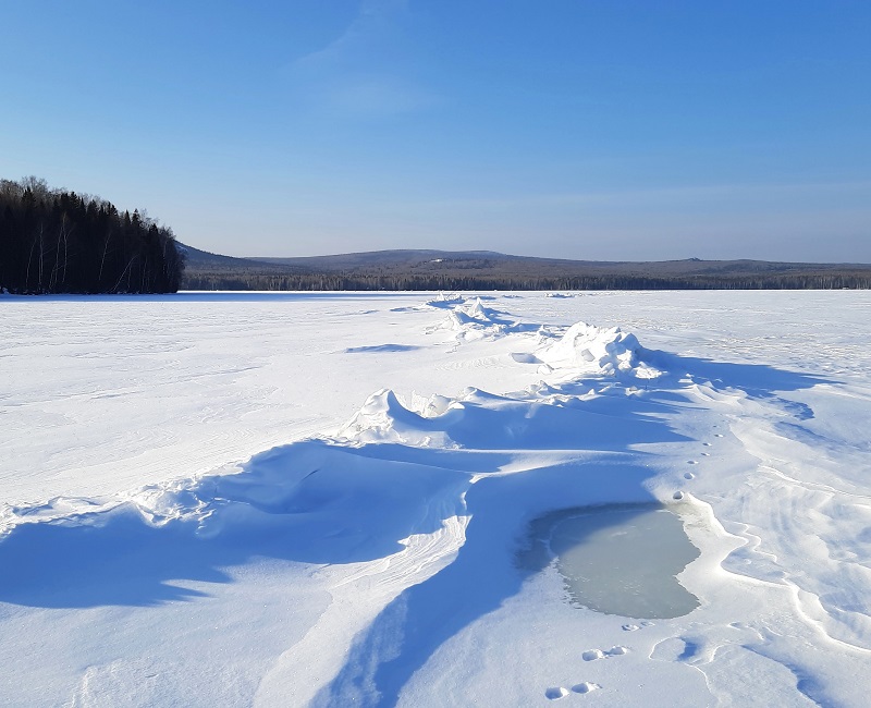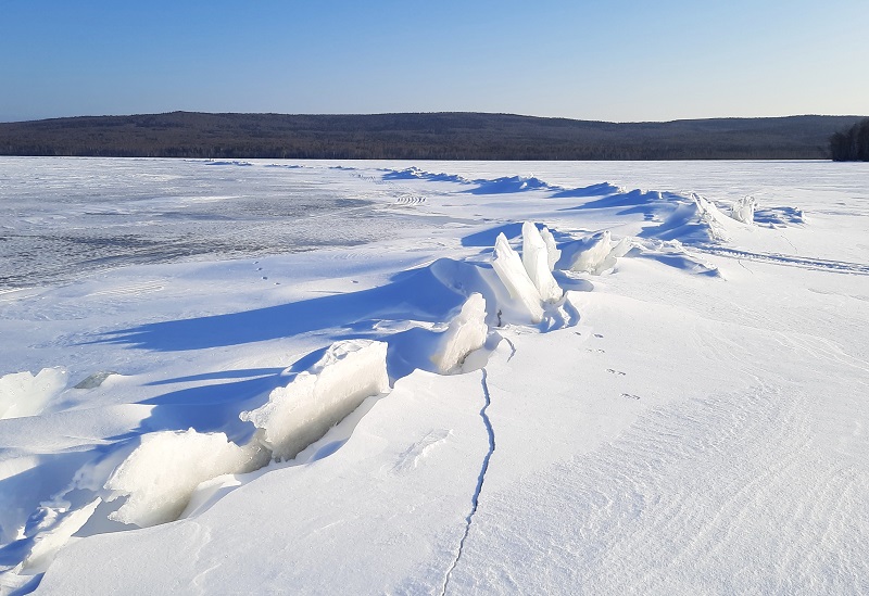 Трещина на льду около Соснового острова уходит к западному берегу пруда. Вдали возвышаются горы: белоснежная гора Пихтовая, Голая, Ипатова и Государев Камень.