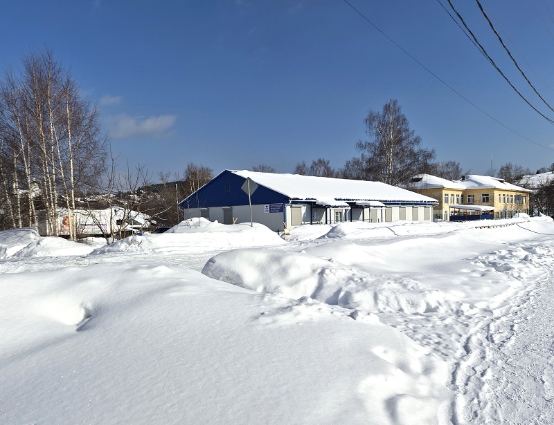 Справа бывшая начальная школа, также вся улица завалена снегом.