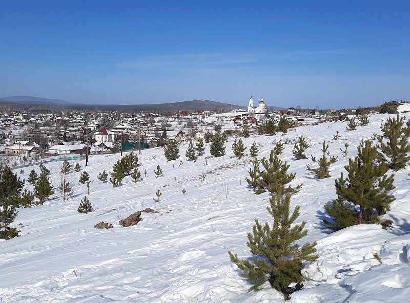 Склоны горы постепенно покрываются молодым ельником. Вдали гора Дыроватик со сквозным отверстием в скале. Центральное место занимает Петропавловский храм, освещенный в 1862 г., в честь отмены крепостного права и правоверховных Петра и Павла.