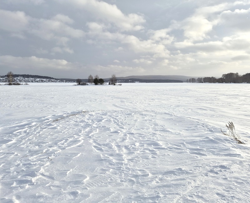 Просторы Черноисточинского пруда, покрытые льдом и снегом. Через плотные холодные облака проглядывают лучи зимнего солнца.