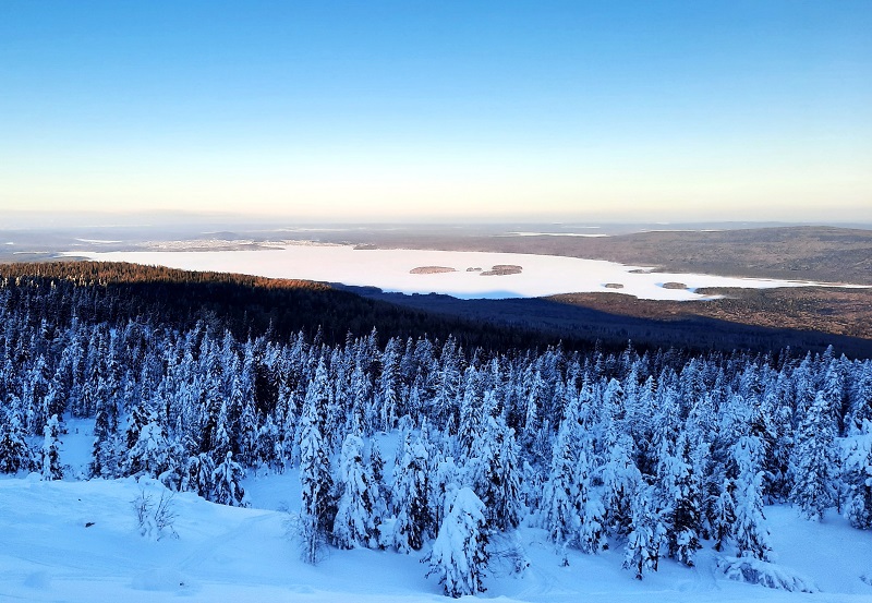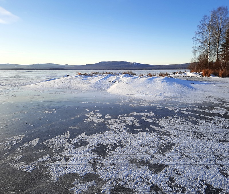 Справа возвышается гора Белая, слева находится остров Сосновый. Интересно идти на лыжах: снег плотный, утрамбованный сильным ветром. Идешь на лыжах и не проваливаешься в снег.