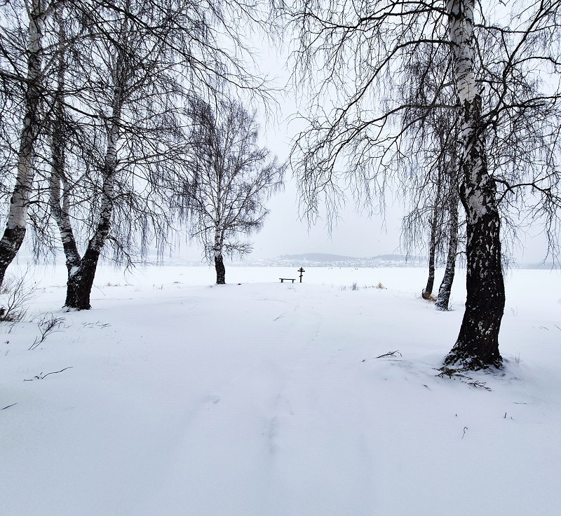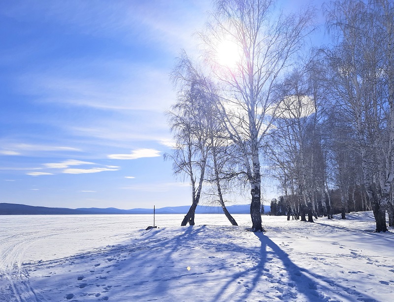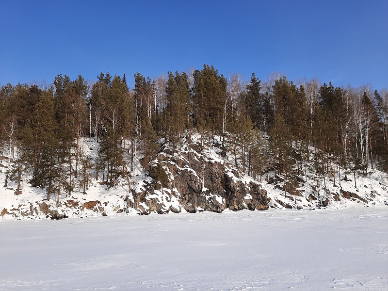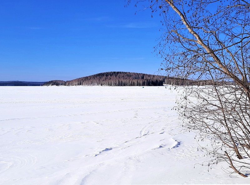 Вторая стрелка на мысе Крутики. Близится конец зимы, яркое солнце осветило лес и пруд, прикрытый льдом и снегом. «Стрелками» называются вдающиеся территории в Черноисточинский пруд.