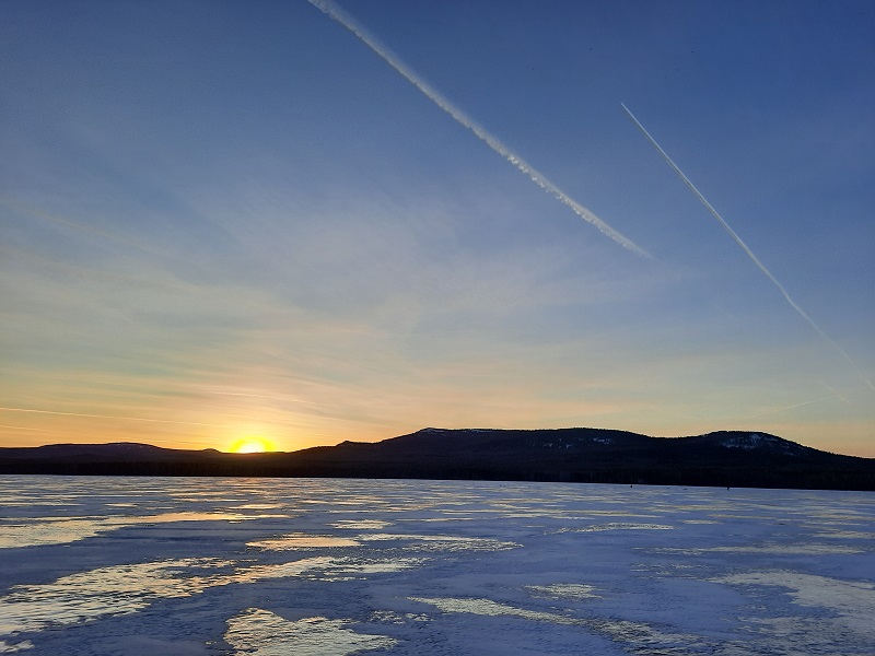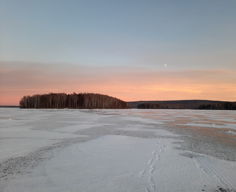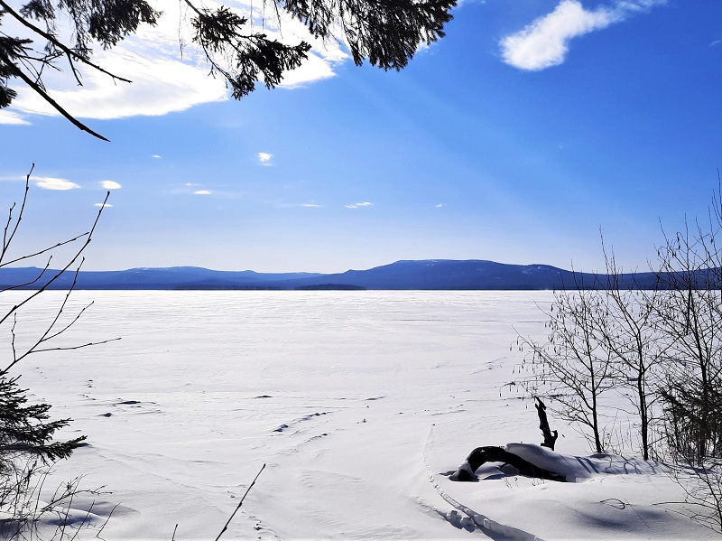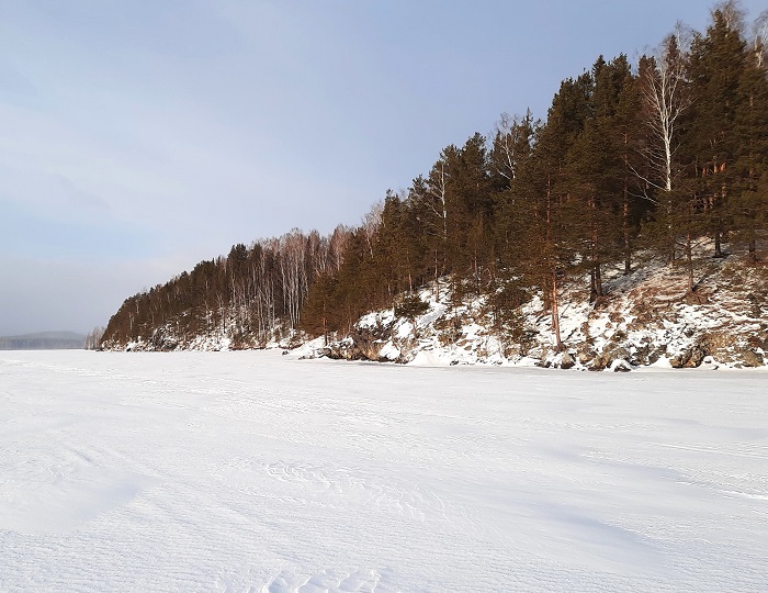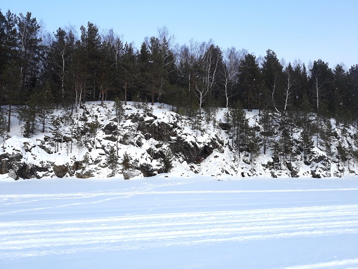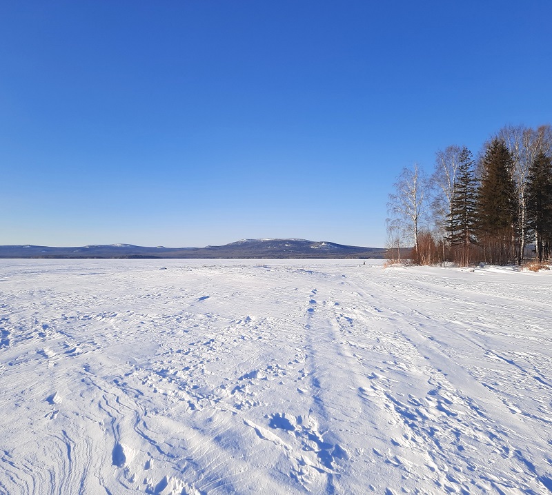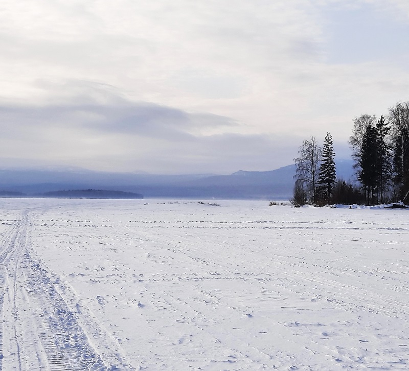 Трещина на льду около Соснового острова уходит к западному берегу пруда. Вдали возвышаются горы: белоснежная гора Пихтовая, Голая, Ипатова и Государев Камень.