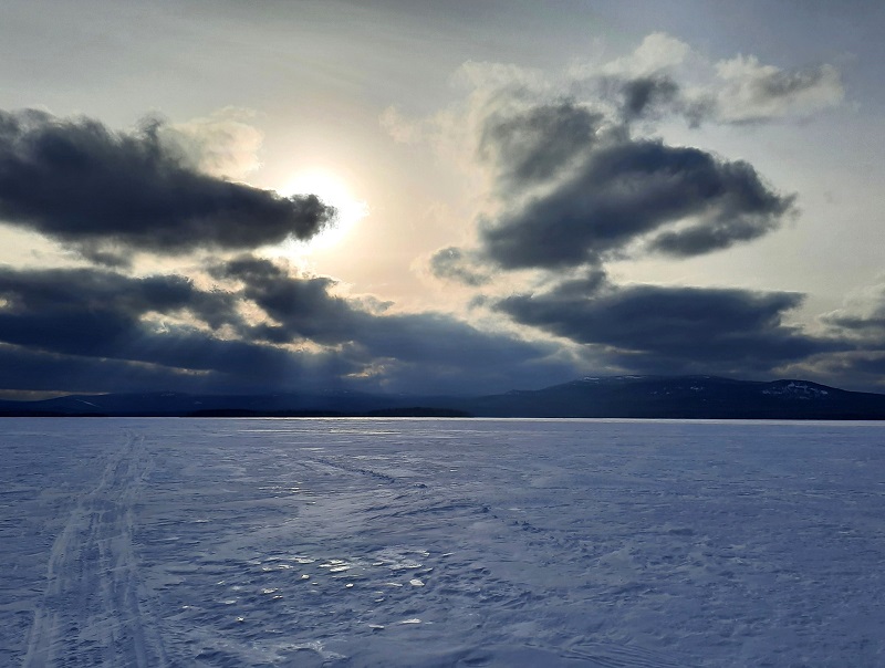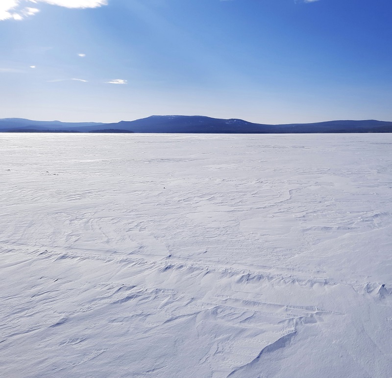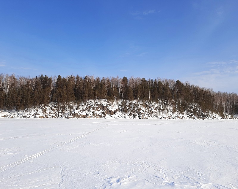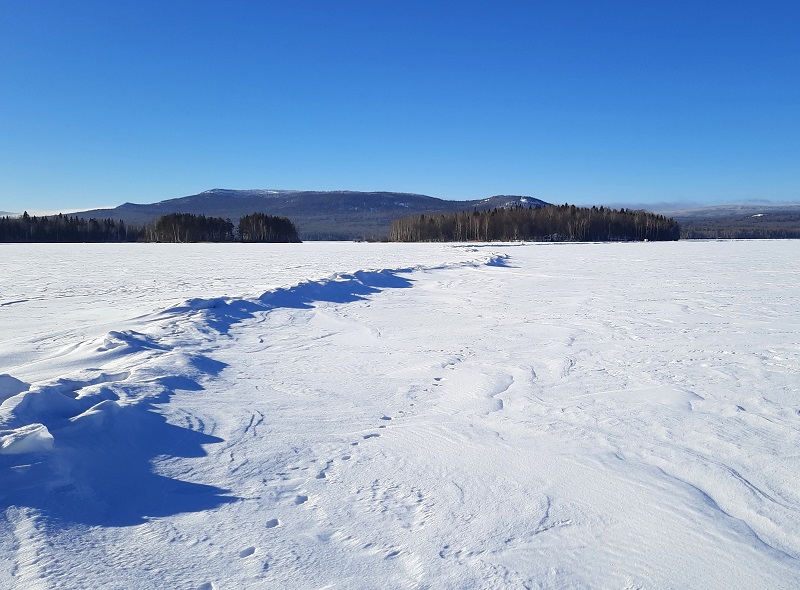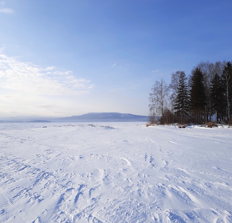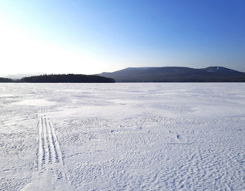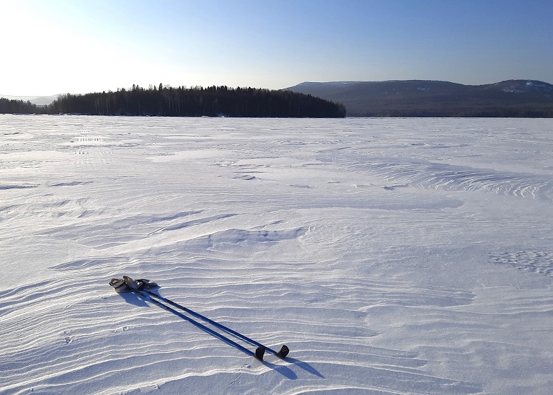 Справа возвышается гора Белая, слева находится остров Сосновый. Интересно идти на лыжах: снег плотный, утрамбованный сильным ветром. Идешь на лыжах и не проваливаешься в снег.