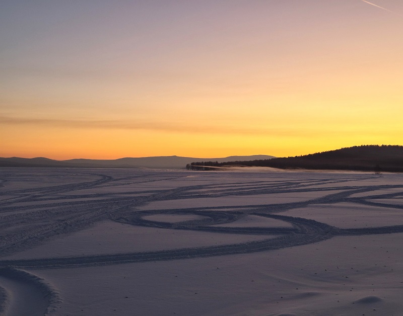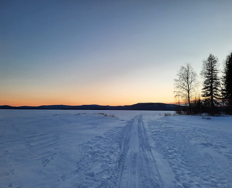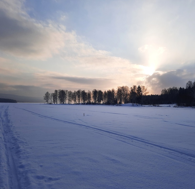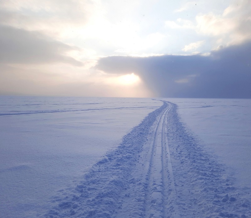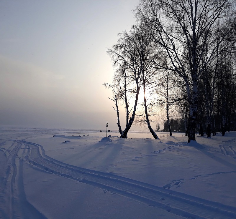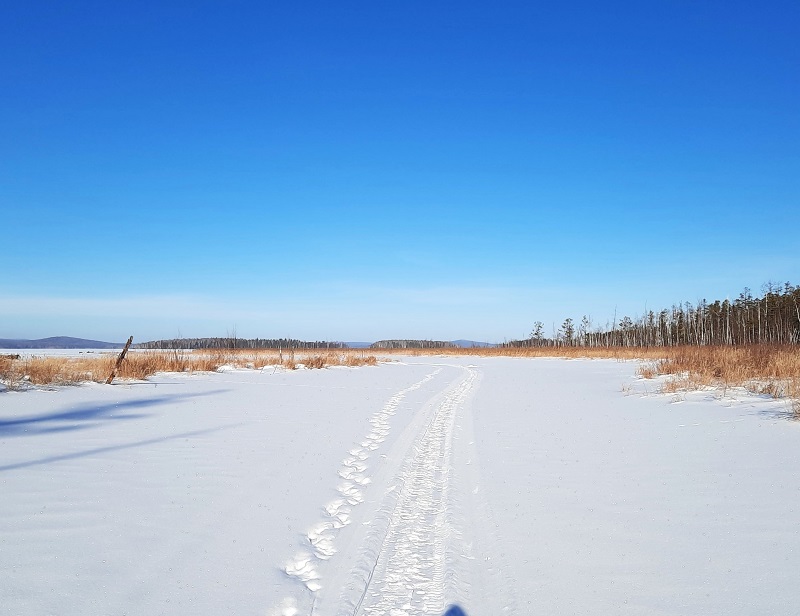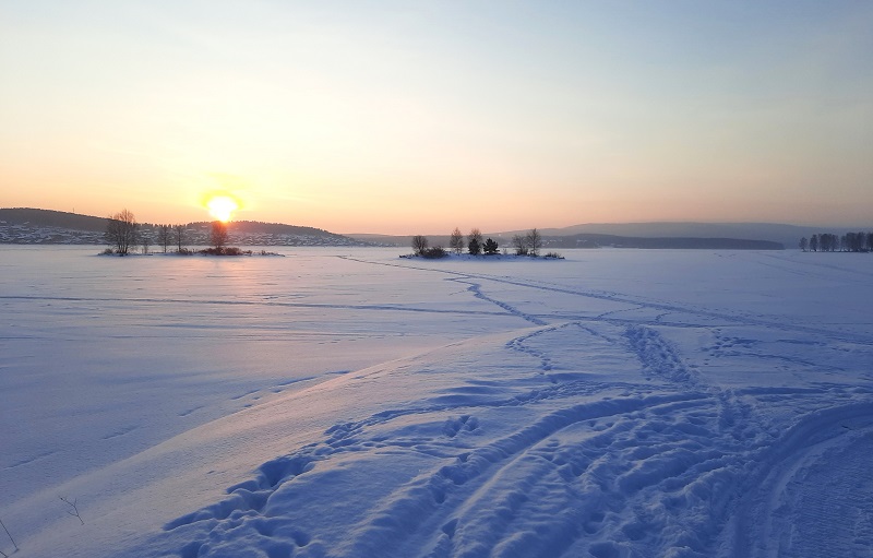Справа возвышается гора Белая, слева находится остров Сосновый. Интересно идти на лыжах: снег плотный, утрамбованный сильным ветром. Идешь на лыжах и не проваливаешься в снег.