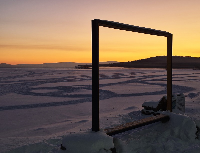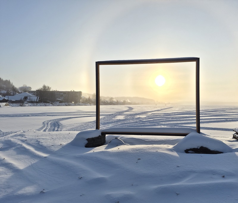 Утром на пруд выходят на лед десятки рыбаков, чтобы заняться зимней рыбалкой. Вид на пруд через арт-объект.