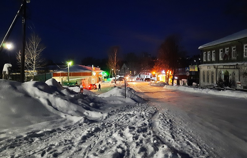 Вечером на улице Кирова в поселке Черноисточинск светятся огнями магазины и административные здания поселка.