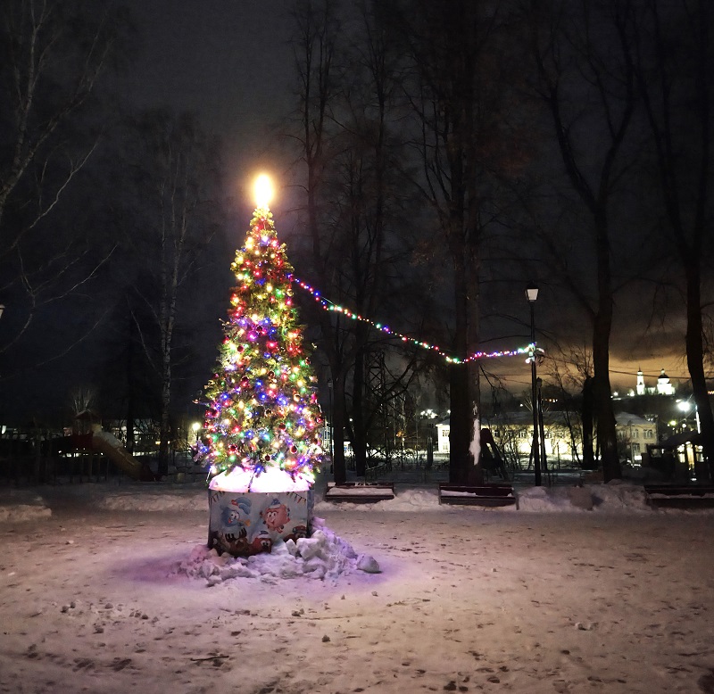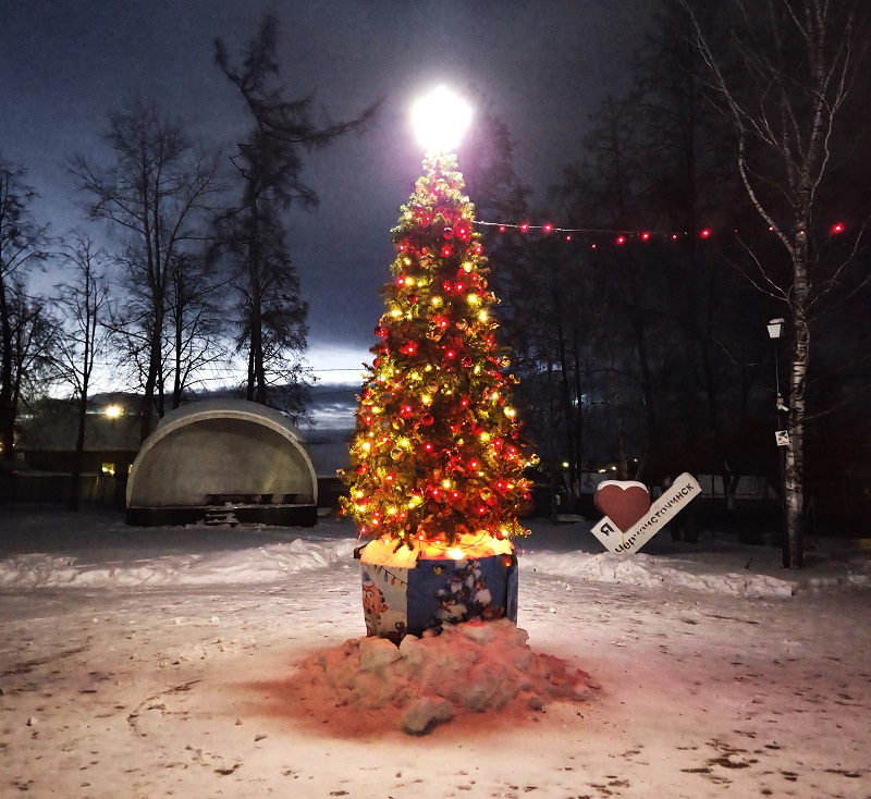 Новогодняя елка ночью в парке поселка Черноисточинск