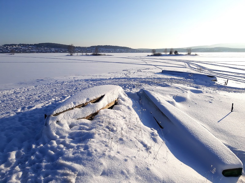 На дамбе под снегом лежат весельные лодки, вытащенные на берег из воды на зимовку. В центре фотографии острова, покрытые мелколиственным лесом. Вдали нагорская часть поселка. Высота снежного покрова может достигать от полуметра до одного метра.