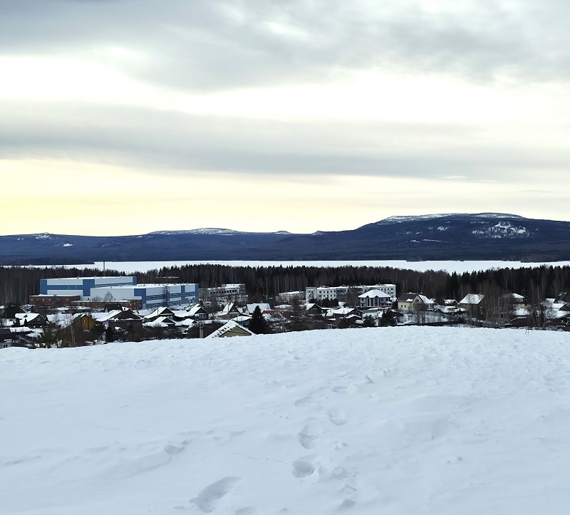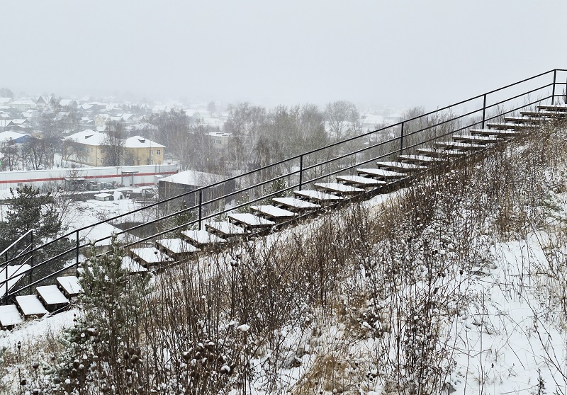 Лестница на склоне Заводской горы, ведущая на смотровую площадку, откуда все как на ладони, горы Урала, заснеженный пруд, дома жителей, и синий горизонт из залесенных гор.