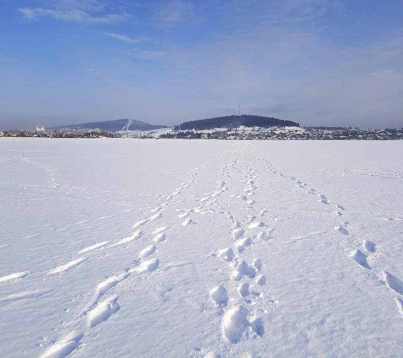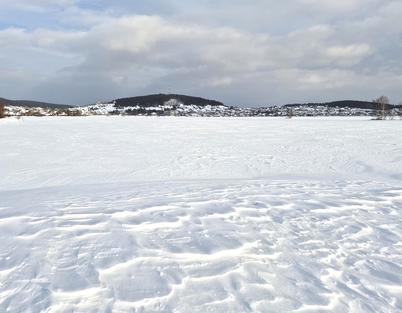 Черноисточинский пруд и снежная пустыня, которая завершается панорамой Веселых гор. Одна за другой поднимаются синие вершины гор: Широкая, Мохнатенькая, Белая, Каменка, Пихтовая, Голая, Ипатова.