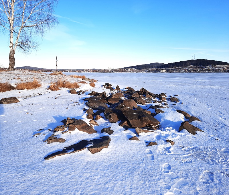 Справа возвышаются горы Каменка и Белая. Слева черной полосой протянулся остров Сосновый, который полон легенд и преданий. Безграничные просторы притягивают своей неизвестностью, поэтому — вперед, к невидимым берегам.