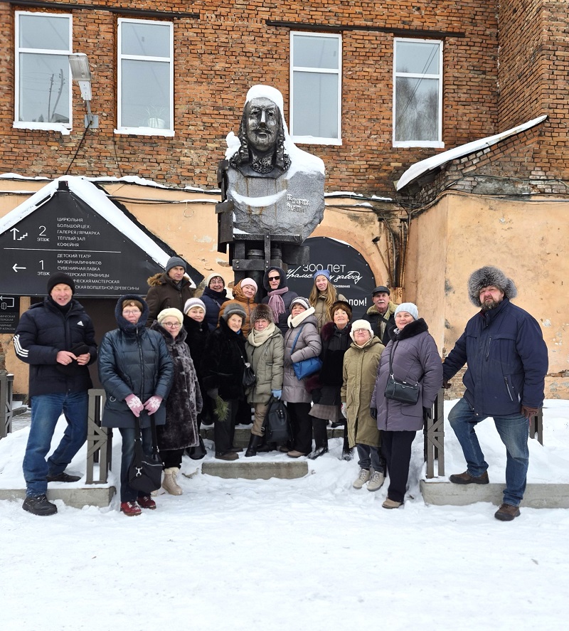 Краеведы Нижнетагильского клуба краеведов посетили креативный кластер, который находится на территории бывшего завода и фабрики. Мы все около памятника основателю Черноисточинского завода Акинфию Демидову.