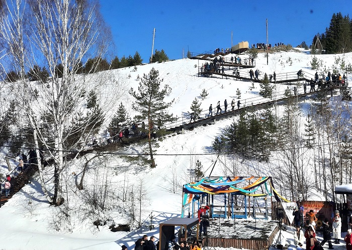 Подъем на Заводскую гору по лестнице на смотровую площадку, в день проведения «масленицы».