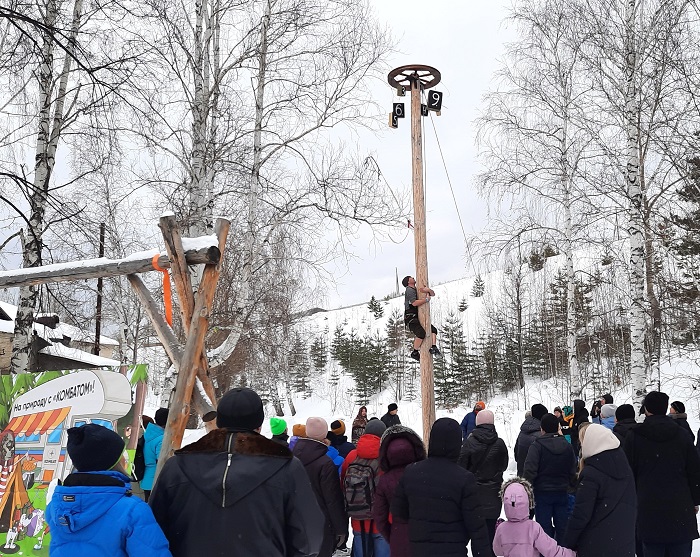Русские забавы в день проведения масленицы. Кто первый залезет по бревну за памятным призом.