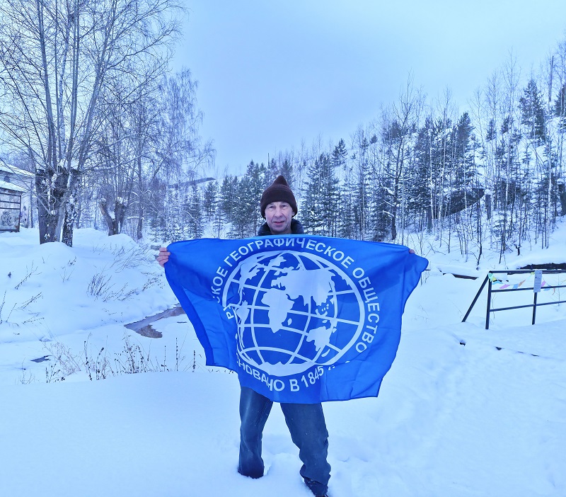 Андрей Пичугин с флагом Свердловского отделения Русского географического общества, на территории креативного кластера.