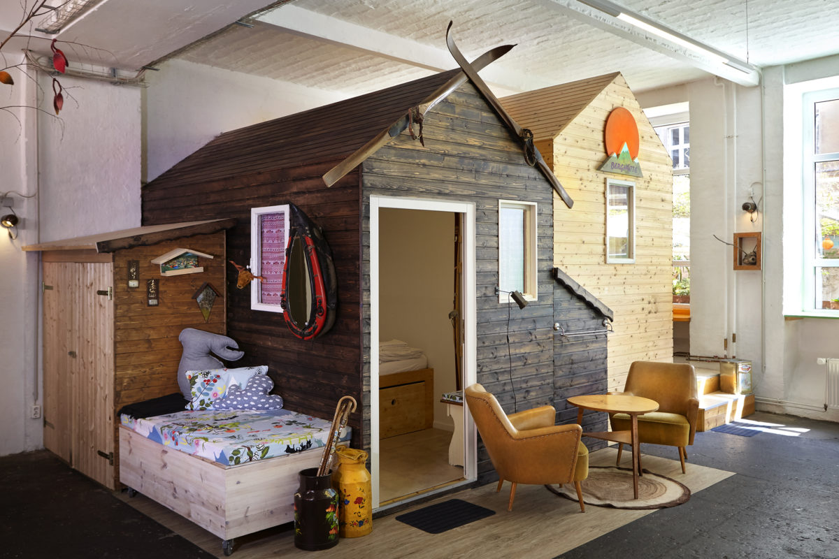 Этот проект отличается от обычных отелей тем, что вы не живёте в стандартном номере, а можете переночевать в уютно восстановленном ретро-Wohnwagen (старом жилом фургоне) или в маленьком деревянном домике прямо в подвале бывшего фабричного двора.