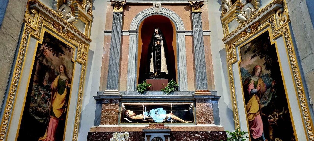В алтаре работы Джузеппе Бароффио находится полотно Распятие 1568 года, возможно, Джованни да Монте Кремаско и цикл из четырех полотен конца 18 века, посвященный жизнеописанию Богородицы.