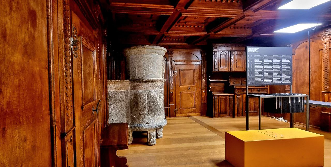 В замке много сохранилось старинной мебели, например, стулья 14 века или стол с отверстием для жаровни внизу. Жаровню ставили, чтобы согреть ноги.