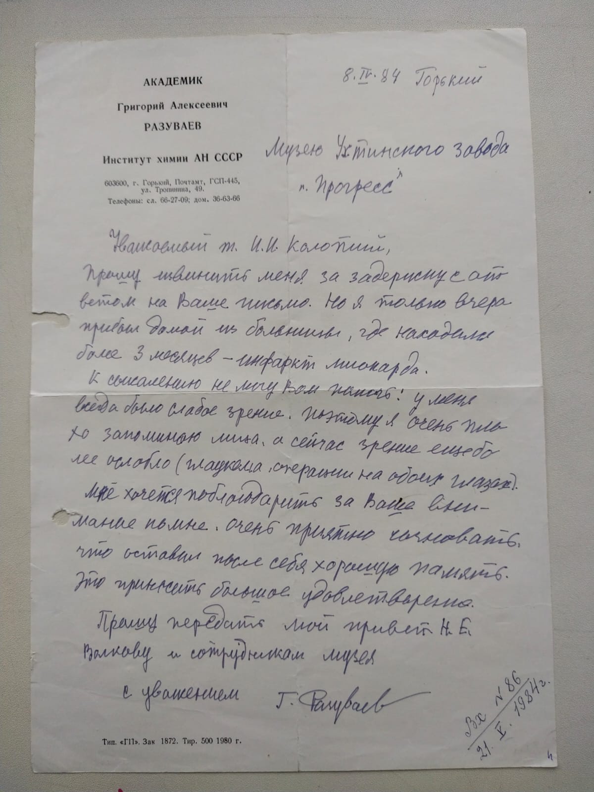 23 августа 1965 г. Г.А. Разуваеву исполнилось 70 лет. Волков поздравил его с юбилеем и его успехами в научной деятельности. В ответном письме Григорий Алексеевич написал: «Дорогой Николай Ефимович, большое спасибо за поздравление с не совсем приятной датой, но время не остановить. Спасибо за приглашение посетить Водный. Мы с Еленой Владимировной часто с хорошим чувством вспоминаем Водный, где провели большой отрезок своей жизни. Волнуемся за сыновей, они должны поступать в вуз. Большой привет от нас всем вам и Сергею Васильевичу Азовцеву. Ваш Г. Разуваев».