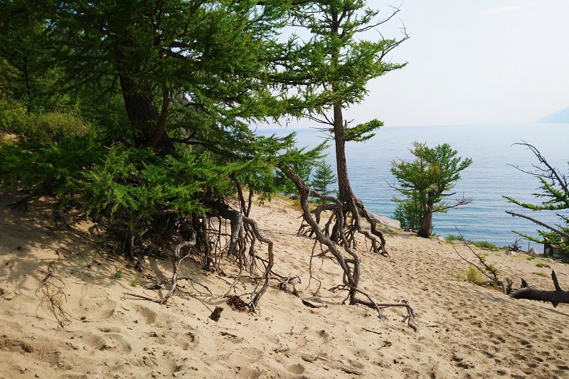 Кажется, будто лиственницы и сосны «бегут» по песку к самой воде, опираясь на мощные корни.
