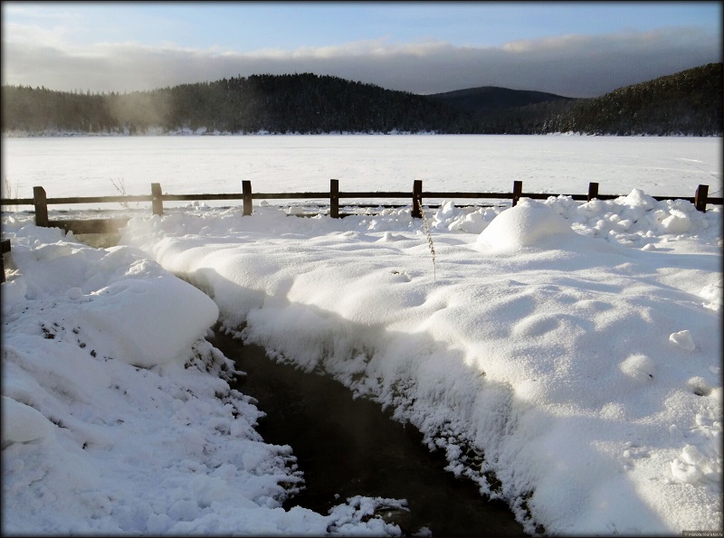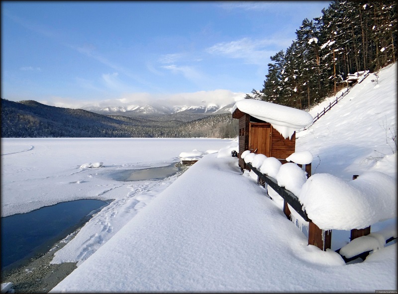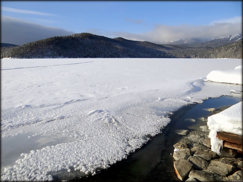 Зимой бухта превращается в контрастный пейзаж: вокруг лёд и снежные сопки, а в деревянных купелях — горячая вода и пар над гладью Байкала. Добираются по льду на снегоходах или хивусах при устойчивом ледоставе.