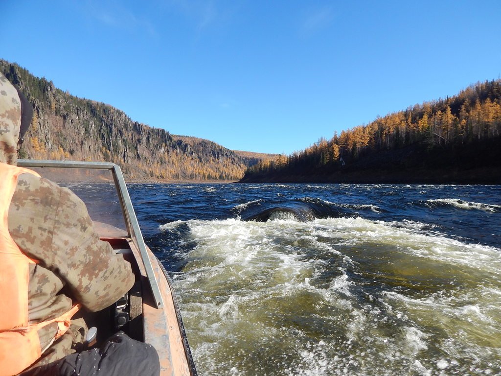 Из Байкита мы, зафрахтовав лодку, отправились в ещё большую глушь – по изрядно обмелевшей р. Подкаменная Тунгуска, через пороги с грозными названиями Дедушка и Бабушка, в н.с. пункт Полигус (23 постоянных жителя). Вот это, я вам скажу, места!