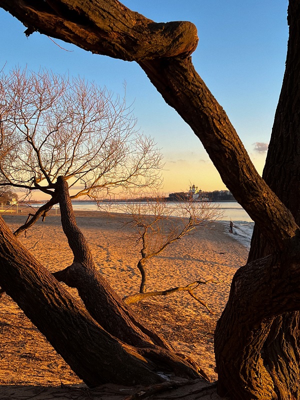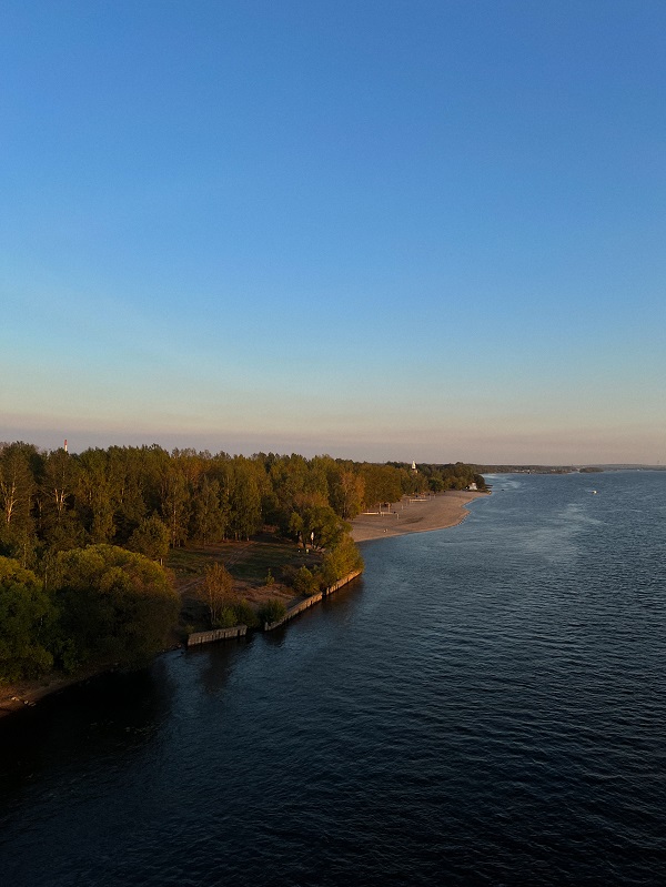 С противоположного берега отлично видны купола церквей и панорама исторического Ярославля — особенно красиво утром и ближе к закату — солнце уходит за правый берег, подсвечивая центр города.