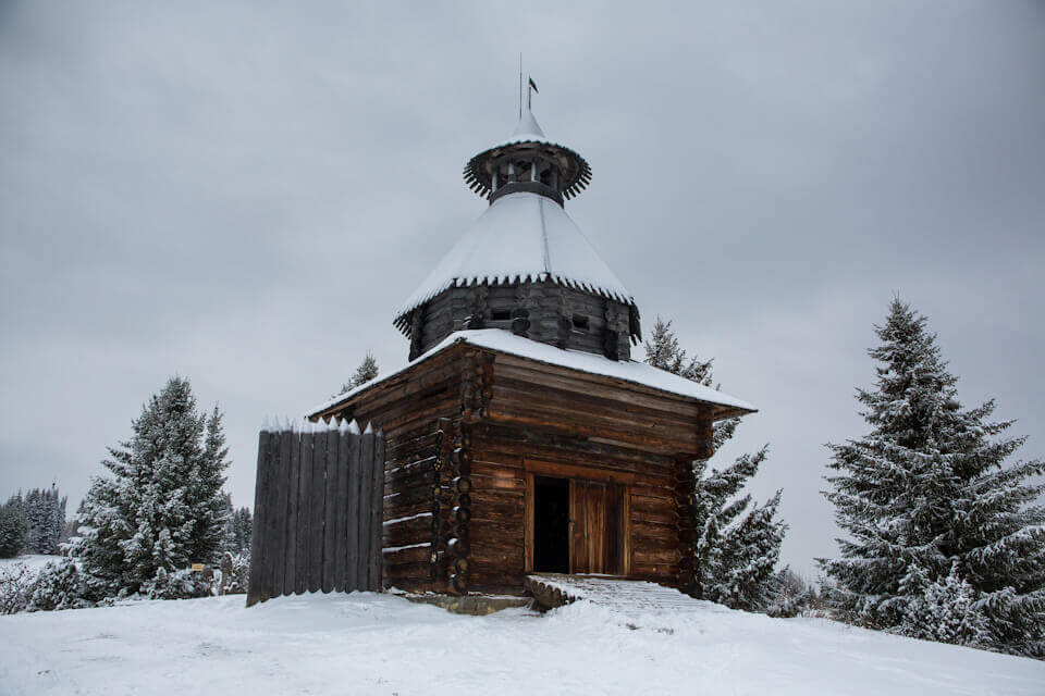 Уникальные памятники зодчества были сюда перевезены из разных деревень Прикамья и умело вписаны в природный ландшафт. Зимой с верхушки холма открывается вид на ледяные просторы Камы, заснеженные купола церквей, зимнее слепое солнце.